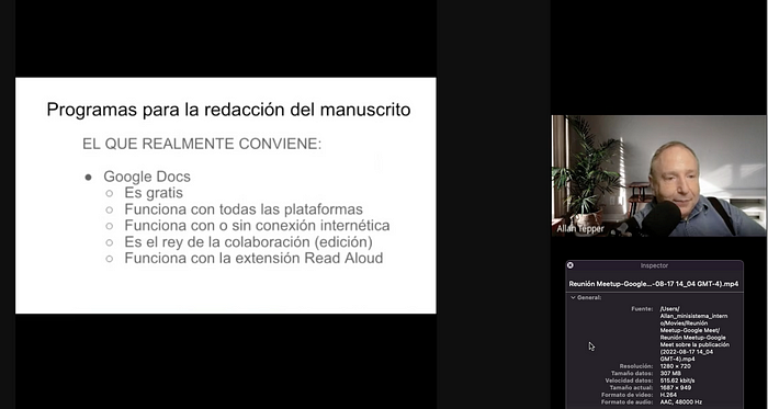 Recientemente he estado conduciendo reuniones Meetup para escritores y autores colegas que quieren redactar, editar, maquetar, publicar, transformar o distribuir sus libros ampliamente. Después de dos reuniones físicas en la Florida, la semana pasada, llevé a cabo la primera internética, con la cual elegí usar Google Meet en lugar de Zoom.us. Lo hice por tres motivos. 1: Ya pago a Google por una cuenta Workspace (previamente llamado G Suites). 2: Mis reuniones duran 90 y minutos y preferí evitar pagar por una cuenta Pro con Zoom.us al ya tener Google Meet. 3: Hace poco, logré dominar el “truco” para lograr usar las maravillosas Presentaciones de Google al seguir viendo las reacciones faciales de los asistentes en un solo monitor de 27 pulgadas. Al terminar la reunión muy exitosa, descargué y verifiqué la grabación audiovisual hecha por Google Meet a mi Google Drive. Quedé feliz al ver que había grabado el sonido correctamente con nuestra norma 48 kHz en lugar de 32 kHz, lo típico con Zoom.us, lo cual que documentado previamente. A continuación verás los detalles técnicos de mi sesión Google Meet (incluyendo la nueva cámara 4K con sensor tipo media pulgada, inteligencia artificial, al igual que el micrófono y consola que usé) junto con un cuadro comparativo con las diferencias clave que ahora encuentro entre Google Meet y Zoom.us.